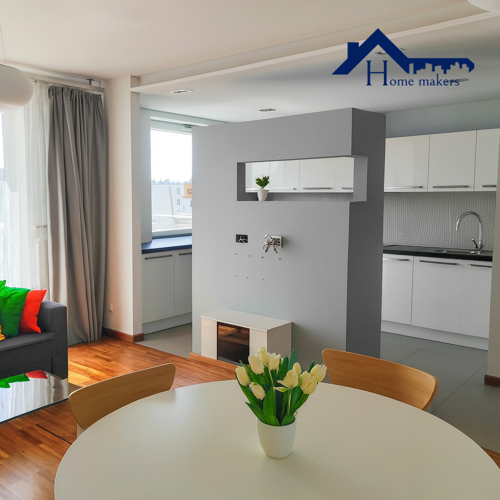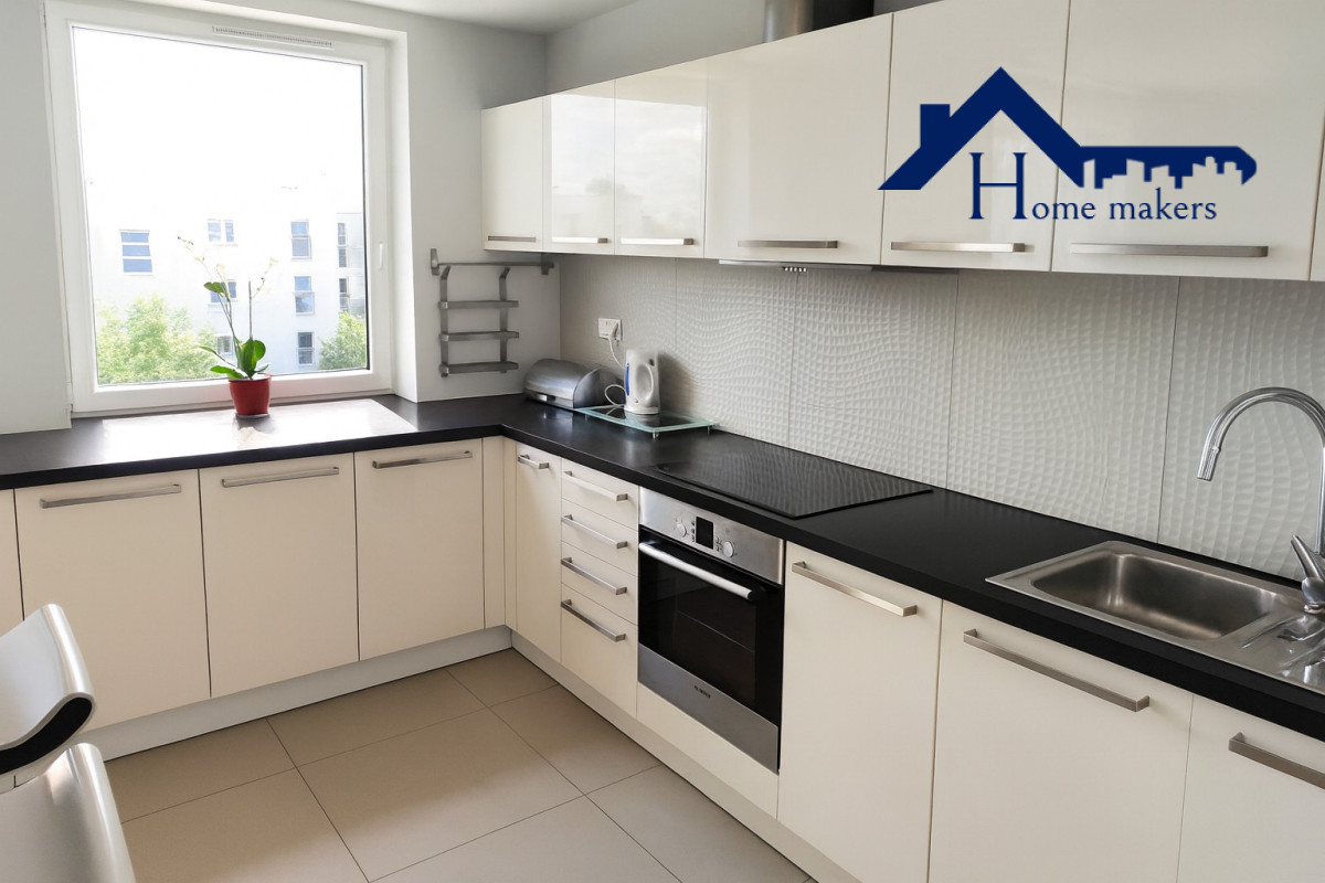 - Kuchnia – wydzielona ścianką z barkiem, meble na wymiar (MDF lakierowany), sprzęt AGD marki Bosch (lodówka, zmywarka, piekarnik, płyta indukcyjna).